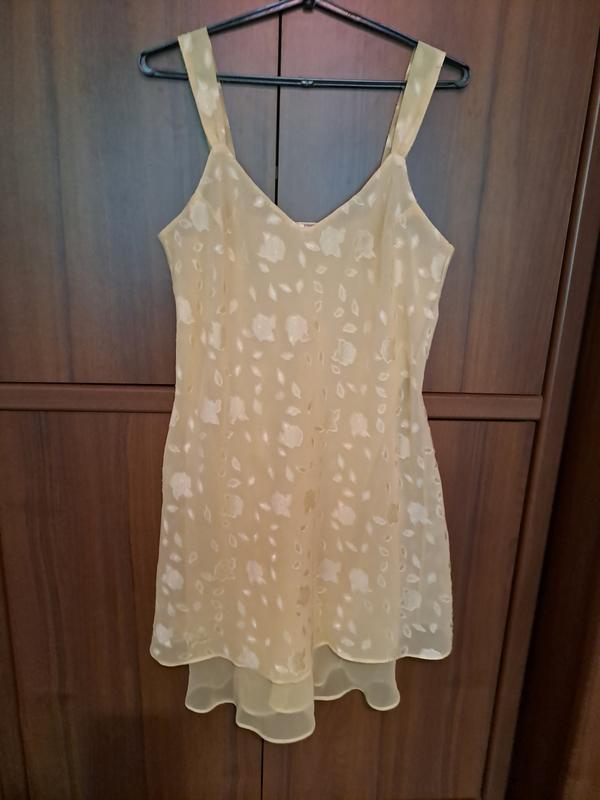 Летнее открытое платье для молодой хрупкой девочки. Изготовлена из полупрозрачной ткани в двух слоях. Нижний слой однотонный, бежевый, более длинный. Верхний с растительным принтом, который создает разницу плотности бежевого цвета. Модель на широких бретелях. Скроена по косой, благодаря чему силуэт расклешенный. Пог.- 47-48, длина от высокой точки бретели- 95-97. 100% современный "дышащий" полиэстер. Линейка молодежной одежды Yessica бренда C & A.