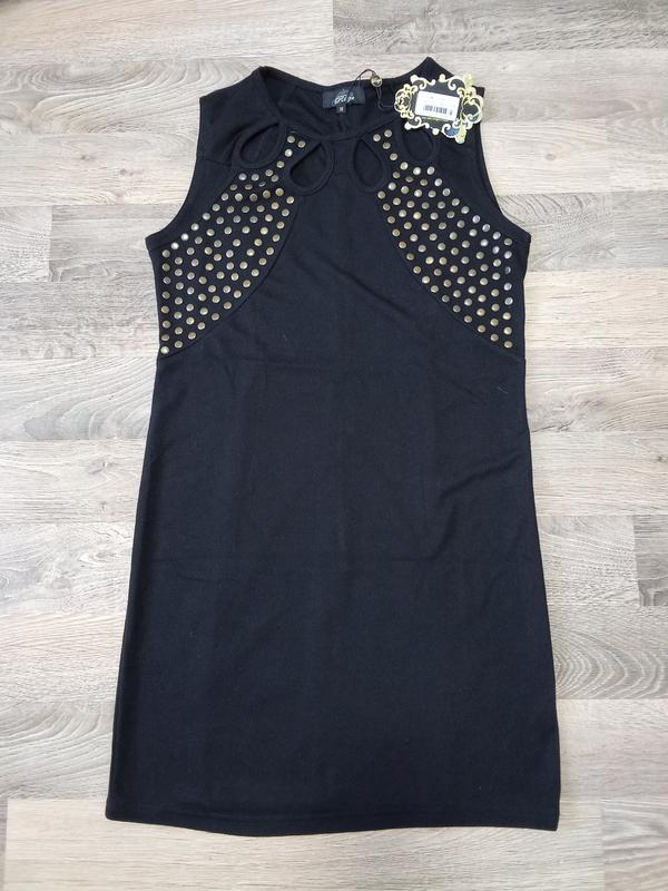 Красивое платье, украшенное металлическими кнопочками, молния позади не действующая, пог 45.5; пот 42.7; длина 87.5, состав ткани не указан, напоминает трикотаж.