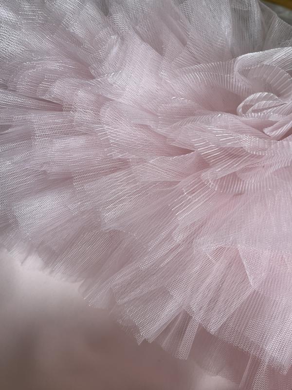 Коротка еластична сукня. Прямий комір і відкриті плечі. Об'ємне тюлеве оздоблення в тон. Контрастна підкладка. Прихована блискавка ззаду.