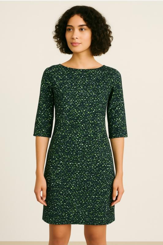 Лаконичное платье COS из фактурной хлопковой ткани Элегантное платье прямого кроя от COS с мелким графическим принтом в оттенках зеленого и синего. Лаконичный дизайн с округлой горловиной и рукавами 3⁄4 создает современный и утонченный образ. Ткань плотная, приятная к телу, почти не тянется. Благодаря составу из натурального хлопка с небольшой примесью эластана вещь держит форму и дарит комфорт в носке. Детали: • Размер от производителя: 34 • Длина: 85 см • Плечи: 37 см • Грудь / талия / бедра: 46 см • Склад: 98% бавовна, 2% еластан Состояние отличное, без нюансов.