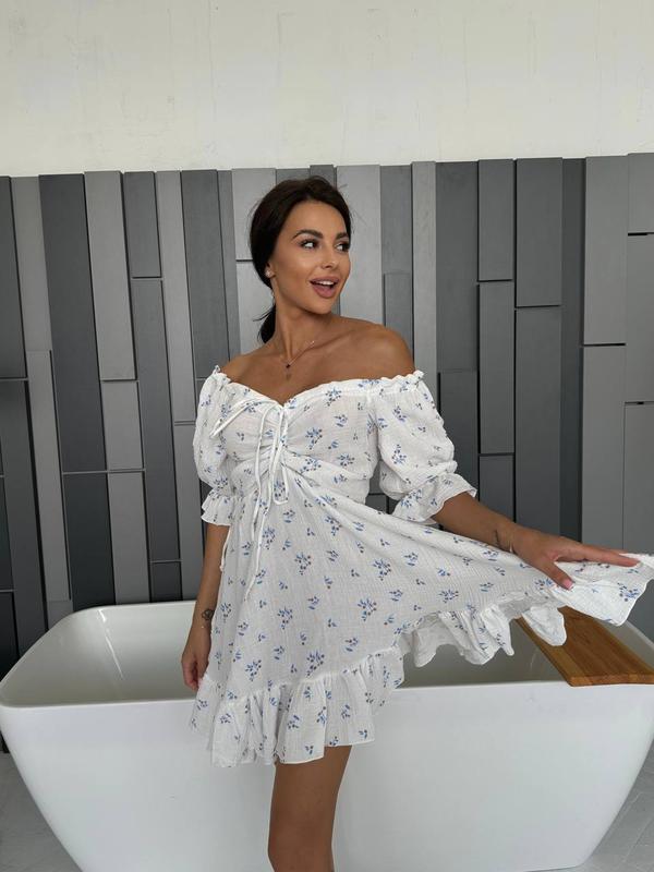 Платье, которое будет вам придавать уверенность в себе и в качестве вы будете стильно выглядеть. Длина до колена. На груди на завязках.Моженная одевать со спущенными и с приподнятыми плечами.Ззади на завязках. Ткань муслин.Размеры:42-44,46-48