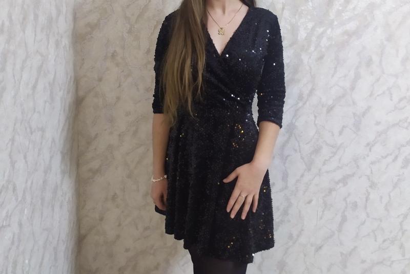 Продається елегантна чорна сукня з паєтками. Матеріал: тканина з блискучими паєтками, гарно переливається на світлі. Фасон: сукня має приталений крій, розкльошену спідницю та довжину приблизно до коліна. Декольте: V-подібний виріз, що підкреслює зону декольте. Стан: дуже хороший, без дефектів. Ідеальний варіант для вечірок, святкових заходів чи інших урочистих подій! Зв’яжіться для уточнення деталей або додаткових фото. Розмір-М