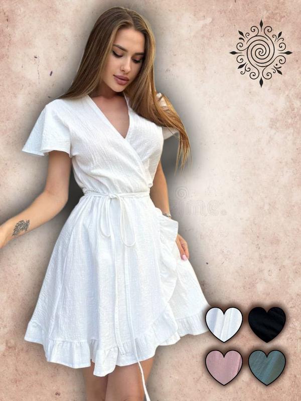 Платье сарафан льняное мини-короткое на запах из льна с пышной юбкой с короткими рукавами...