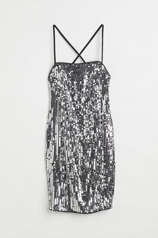 Стильное короткое платье на бретельках расшитое пайетками с открытой спинкой H&M. Размер CL. Новое с этикеткой. Ткань полиэстр, есть подкладка, сзади шнуруется, и есть замочек на бедрах. Замеры грудь 46см (регулируется шнурками), бедра 55см, длина от декольте 75см