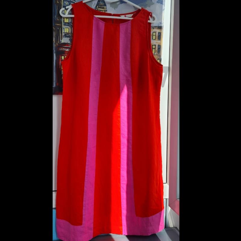 Элегантное и яркое платье от бренда Boden, интересное сочетание красного и розового цвета ткани 100% льна, по спинке молния и пуговица. В таком платье Вы не останетесь не заметной. Размер - 48, добавляю замеры :длина - 95см, плечи-38см, пог-50см, пот-48см.