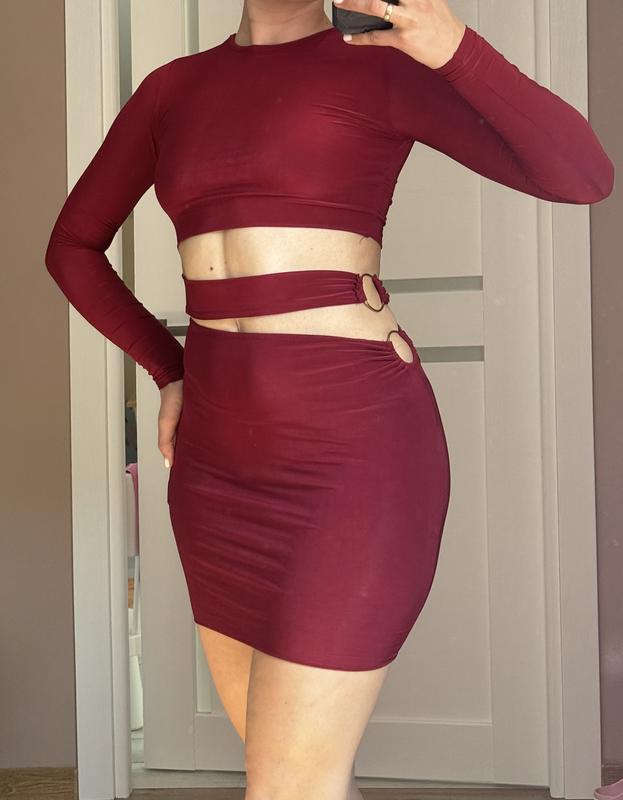 Очень женственное платье с акцентными кольцами на талии, подчеркивающими ее Приятная на ощупь Цвет на бирке указан темно сливовый, цвет Бордо Рост модели 168, размер 47 м Платье подойдет на S Дополнительные фото и замеры могу сбросить