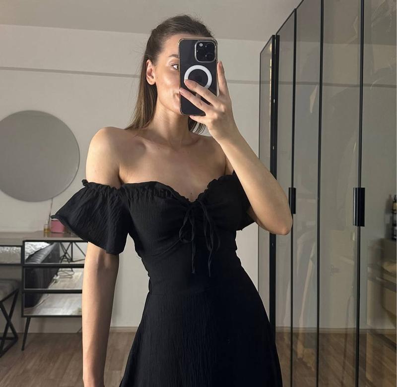 Новинка🤍 Сукня😍 Модель 203fb ▫️Размер : 42-44, 46-48 ▫️Ткань: американский креп ▫️Цвет: черный, белый, мокко Нереальное, невесомое платье которое подчеркнет твою талию😍 Сзади затягивается на завязки. Белый цвет идет с подкладом🫶🏽