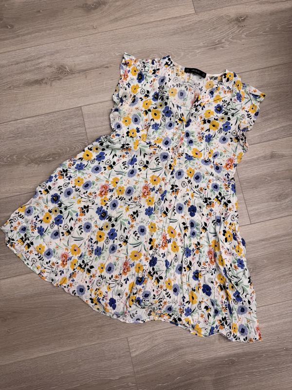 Ніжна жіноча сукня з короткими рукавами, виконана в яскравому квітковому принті на білому тлі. Має V-подібний виріз горловини та злегка приталений силует, що переходить у розкльошену спідницю. Застібається на невеликі ґудзики спереду до лінії талії. Легка та повітряна тканина ідеально підійде для спекотних літніх днів, створюючи романтичний та жіночний образ. Заміри: Довжина: 81см ОГ: 72см