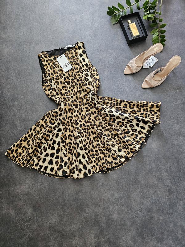 Платье клеш Размер S M Мини-платье без рукавов с круглым вырезом. Эластичный подол. Сзади скрытая застежка-молния в шве. Леопард