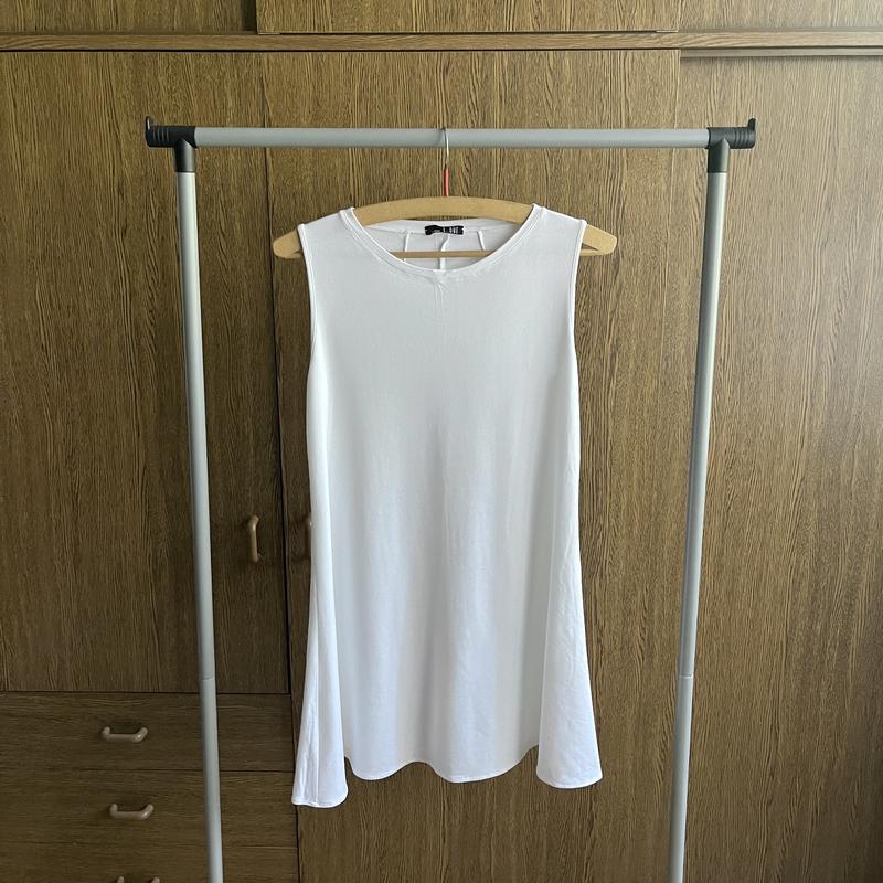 Белое платье. Материал тянется. К низу расширено. Standard fit Плечи 34 Груди 41 Ширина по центру 45 Ширина внизу 79 Длина 76