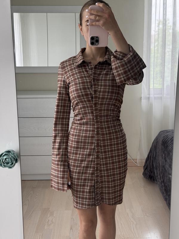 Коротка, облягаюча сукня з твілу з віскозної суміші з коміром, застібкою на ґудзики спереду, подовженими рукавами та широкими манжетами з розрізом. Зібрані бічні шви на талії для створення чіткого силуету. Без підкладки. Без дефектів. Більше інформації в приватні повідомлення!)