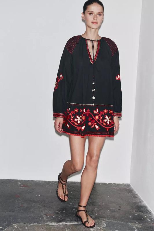 ZARA WOMAN COLLECTION Короткое платье из смешанной штапельной ткани из хлопка и 12% льна. Вырез со шнурками для регулировки на воротнике, длинные рукава с манжетами и контрастная вышивка.
