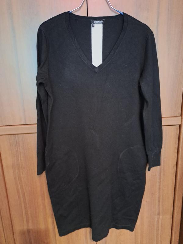 Женское платье- туника. Основной цвет - черный, перед с V-образным вырезом горловины, спинка с акцентной белой вставкой (см. фото2). Два кармана. Силуэт прямой, слегка зауженный книзу. Размер от производителя- 44. Пог.- 55, длина- 101, длина рукава- 60 см. Трикотаж мягкий, пластичный, 80% вискоза, 20% нейлон. Будет эффектно с белой рубашкой или блузкой.