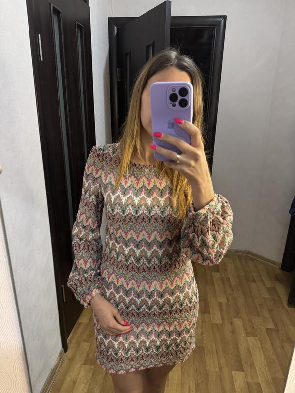 Жіноча сукня Принт: етнічний/геометричний з візерунками в стилі бохо Крій: прямий, міні-довжина Рукави: довгі, об’ємні, з резинкою на зап’ясті — типовий елемент бохо-стилю Тканина: легка й структурована, часто використовується для створення невимушених образів В грудях 39см, по плечах 34см, довжина рукава 58см, довжина по спині 84см
