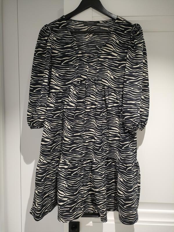 Женское платье с воланами принт зебра в идеальном состоянии без пятен и дефектов Размер по бирочке м, но свободного кроя, будет и на л Длина от горловины до низа 88см Длина рукава от плеча до низа 44 см Ширина по груди от проймы до проймы 46см Ткань жатка, не просвечивается