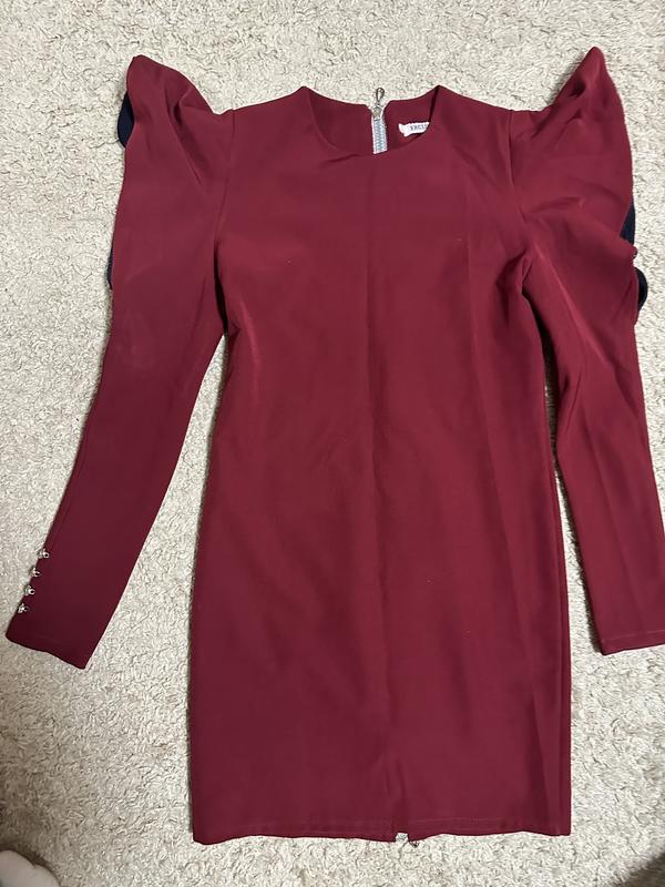 В ідеалі ,на зріст 160 вище колін , ззаду молнія,рукава розрізи і ідуть як колокол