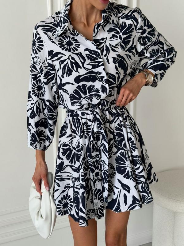 Короткое платье рубашка с поясом и пышной юбкой с цветочным принтом