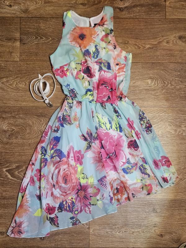 Размер 36 Легкое, нежное, воздушное платье. Юбка асимметричная. Можно носить под поясок. На подкладке. Не светится. Материал-шифон Замеры: Груди - 82 см Талия-(на резинке) до 80см Стегна-90см Длина изделия - 86-103см