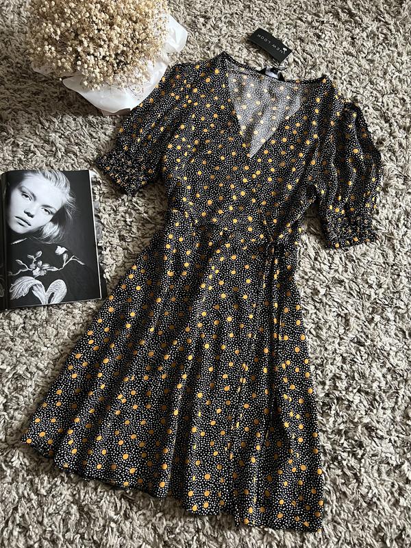 Сукня на запах Довжина 86 см, н/о в грудях 47-49 см, на запах; в поясі н/о 37 см, регулюється на зменшення пояском, в бедрах н/о 50-52 см