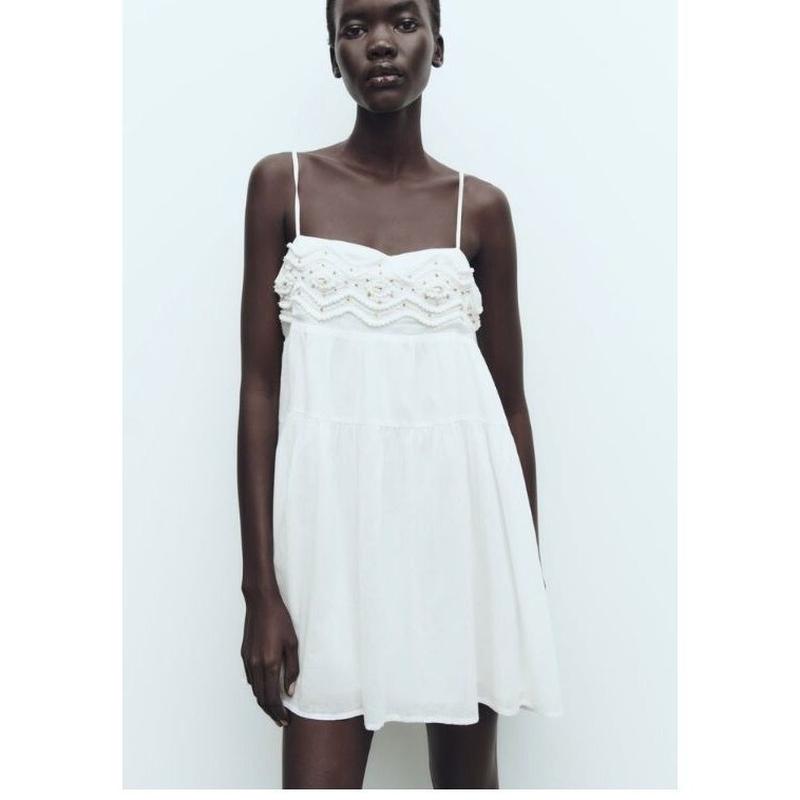 Міні-сукня з прямим вирізом і регульованими брительками. Внутрішня підкладка в тон сукні. Ззаду деталь з гладкої еластичної тканини.
