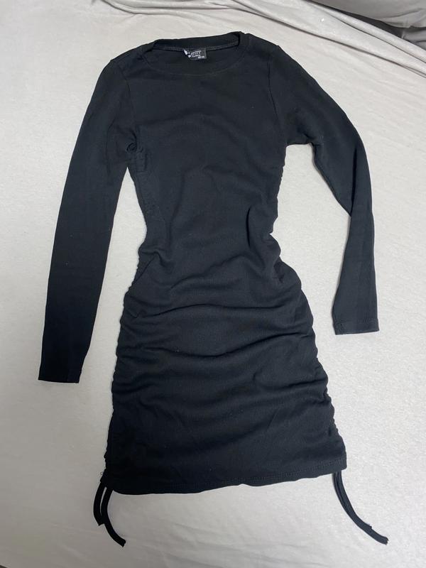 Чорне плаття, збоку на завʼязках Розмір xs, але підходить і на s Колір - чорний, без принту Напівобʼєм(НО) грудей - 28см НО талії - 26см НО стегон - 33см Довжина виробу від плечей - 85см Довжина рукава - 55см Матеріал - рубчик Без дефектів, стан ідеальний, як новий
