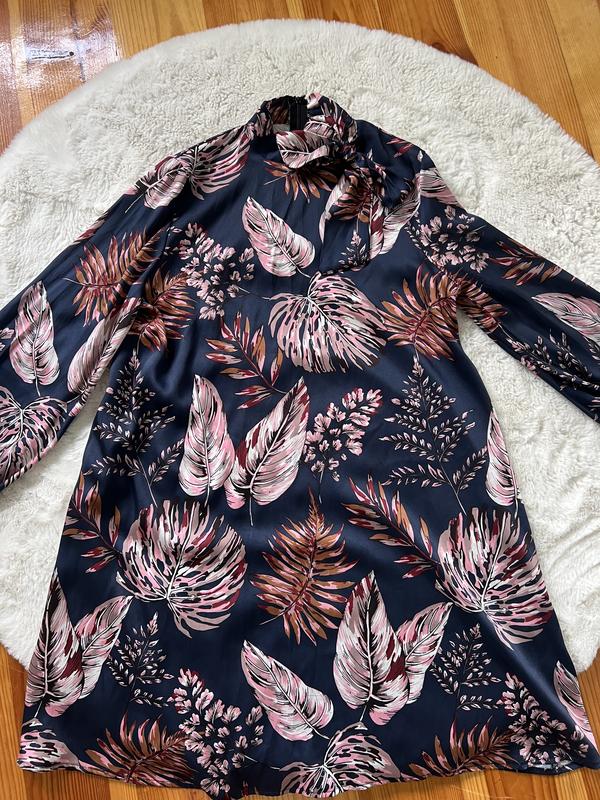 Яскрава та стильна сукня вільного крою з оригінальним тропічним принтом. Колір: темно-синій фон із листям у відтінках рожевого, бордового та пудрового. Тканина приємна до тіла, не просвічується. Модель: А-силует, з довгими рукавами на резинці та комірцем із зав’язкою Підходить на кожен день Розмір: S