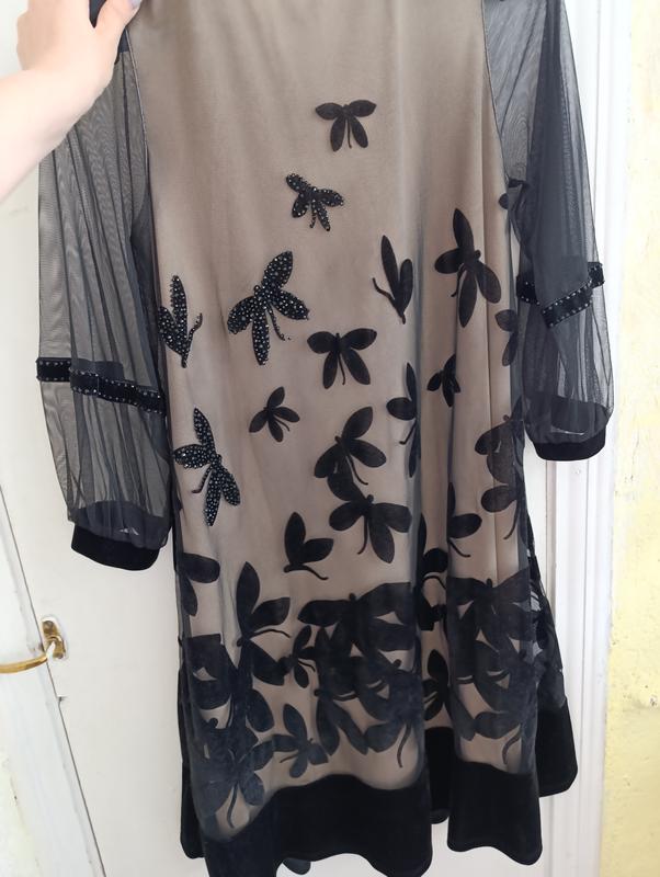 трапеция, производитель Турция,фирма my twins. Платье в бабочки, украшенное в бисеринки, есть вставки велюр. Очень нарядное, классическое, удобное. Замеры: длина 102, ог 51, рукав от плеча 52, платье по низу 96. Тканина тягнеться