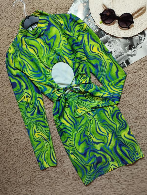 В идеальном состоянии. Яркое платье с вырезом.. Тканина легка, тягнеться. Выглядит супер 😍 Размер 8/36/S, но смотрите по замерам Замеры (полуобхват): Грудь 38( тянется до 45) Талия 31 (тянется до 39) Бедра 42 (тянется до 49) Рукав 57 Длина от плеча 79