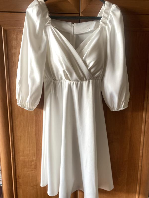 Нежное белое платье из воздушной ткани с атласным блеском. Очень женственная модель с V-образным вырезом и объемными рукавами до локтя. Красиво садится по фигуре благодаря резинке под грудью, застегивается на молнию сзади. Размер: S (подойдет и на XS) Состояние: одета только раз, как новая Идеально подходит для фотосессий, выпускного, девичника или даже для росписи.