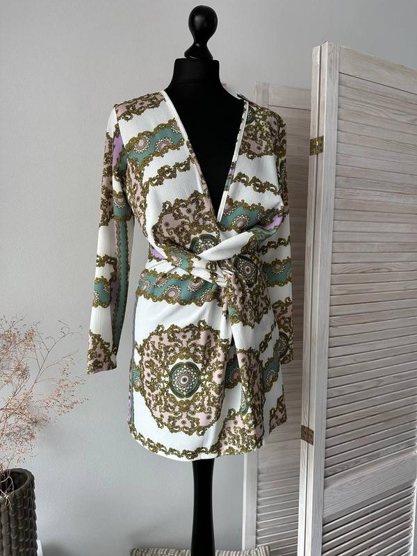 Платье с глубоким декольте турецкий принт Boohoo Размер - 10\38\M Подойдет и на другой размер, смотрите по замерам На сайте стоит нонад 800 грн. Длина изделия - 82 см. Обхват грудей - 92 см. Обхва талии - 66 см. Обхват бедр - 102+6 см. Плечи - 38 см. Длина рукава - 58 см. 97% полистер 3% еластан