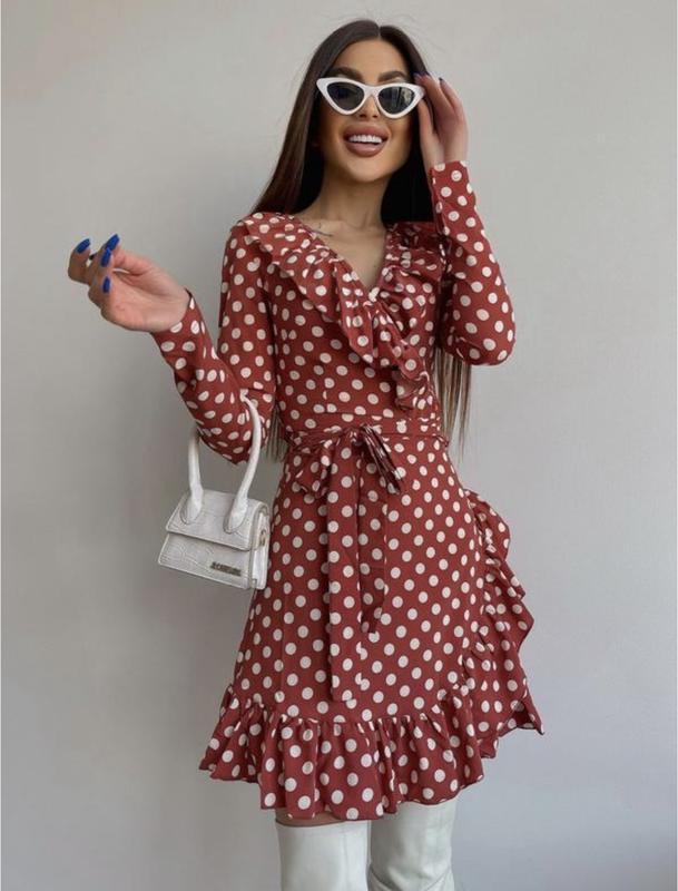 Плаття на запах з рюшами з літньої тканини Пояс пришитий, тим самим регулюється обʼєм Розмір 44-46 (С-М) Нова, тканина практично не минеться В горошок, гарно виглядає
