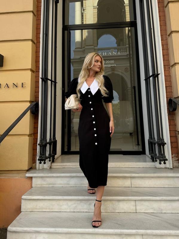 Елегантна сукня з білим комірцем 🔥 ▪️Мод: 297 ▪️Ціна:1050 грн ▪️Тканина: костюмка, комірець-котон ▪️Розмір: 42-44 та 44-46 Сукні з білим комірцем не втрачають своєї актуальності. Класичного темпераменту моделі надає чорний колір. Завершують образ декоративний комір і білі ґудзики . Чорний колір підходить для будь-якого сезону. А чорна сукня - це завжди найкращий вибір для будь-якого заходу. Вона уособлює сучасний мінімалістичний підхід і створює основу для безлічі твоїх неймовірних образів.