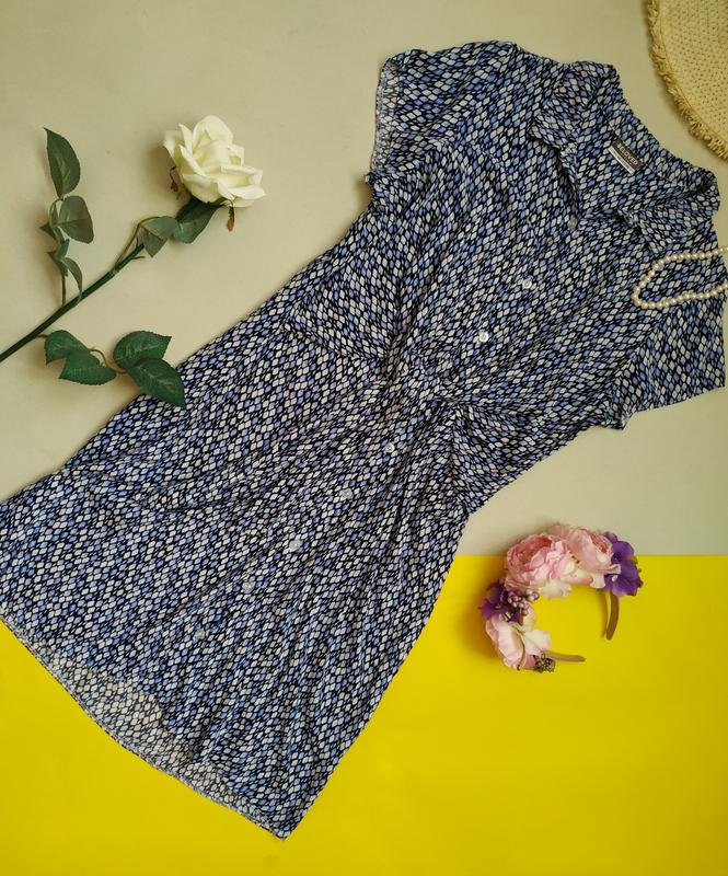 Платье в принт абстракция, без рукавов, крой прямой с завязками, на пуговицах, не тянется, ткань вискозная штапель, очень мягкая и приятная на ощупь р. М, небольшая L Длина 92см Полуобхват груди 50см Полуобхват талии 43см Полуобхват бедер 50 см Плечи 35см Состояние идеальное, практически новое