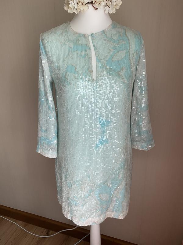 Довжина 77 ПОГ 48 ПОТ 45 Плече 11 Рукав 45 Пройма рукава 21 Ширина рукава в біцепсі 15 Розмір S Розшите прозорими паєтками, прямий силует, колір тіффані.