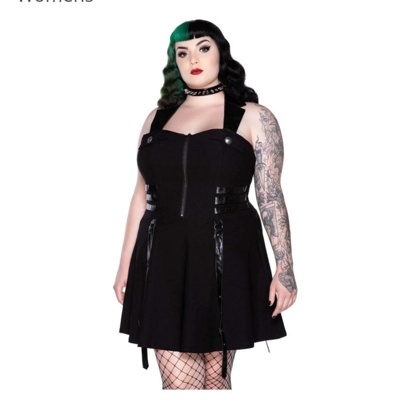 Оригинальное платье Psy-Ops: бренда Killstar. Модель халтер изготовлена из суперэластичной ткани для идеальной посадки. Верх с крутым воротником в форме лацкана, имитацией накладных карманов на груди, украшенных пуговицами с гербом Бафомета и декоративными полосками на талии. Расклешенная мини-юбка с длинными лямками из искусственной кожи с пряжками. Декоративная молния на передней части корсажа. Функциональная молния сзади. Размер: XL. ПОГ - 50 см. ПОТ - 42 см. ПОБ - 54 см. Длина - 87 см. Материалы - Платье - 72% вискоза, 26% нейлон, 2% эластан. Отделка - 55% полиэстер, 45% полиуретан.