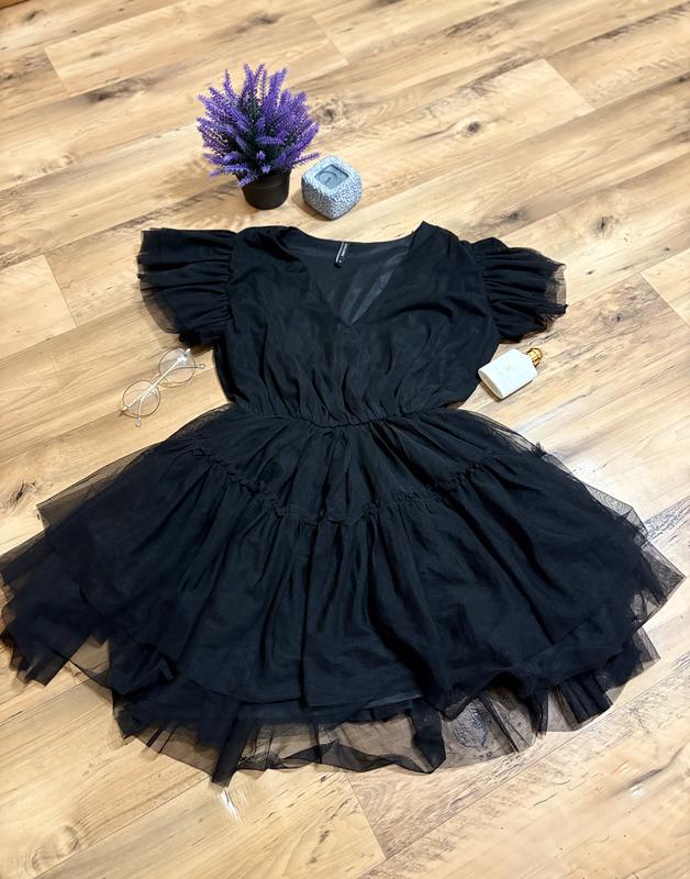 Витончена чорна сукня з фатину. Дуже пишне , знизу атласна підкладка. Відмінно підійде на будь-який захід. Без дефектів Розмір :S Усі фото реальні — по запиту надішлю додаткові.