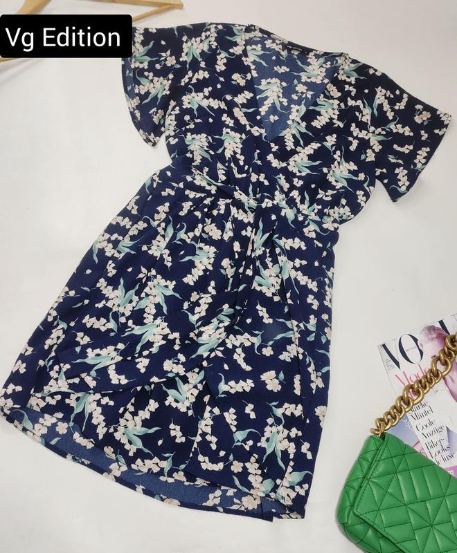 женское платье мини синего цвета в цветочный принт, платье с короткими рукавами, на запах с завязками, в красивом состоянии 😉