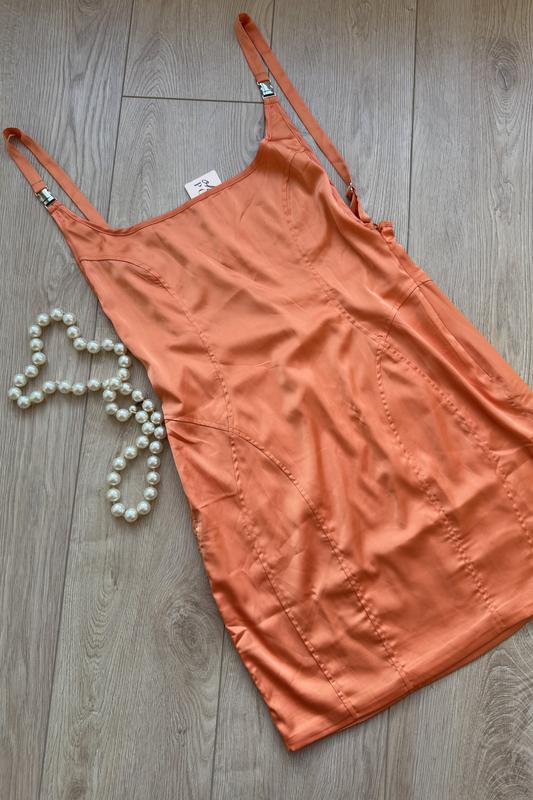 🍊 Яскрава шовкова сукня-комбінація | В стилі Jacquemus Стильна сукня насиченого помаранчевого кольору. Приталений крій красиво підкреслює фігуру. Тканина гладенька з легким блиском, дуже приємна до тіла. Елегантні тонкі бретелі з металевими акцентами — виглядає дорого та ефектно. ✨ Стан: нова, на бретелі 3 плямки (фото додала ) 📏 Розмір: UK14 US 10 👗 Довжина: міні 🌸 Ідеально для вечірок, фотосесій або особливих подій Розмір L Довжина - 64 см Піобхват грудей - 37см Піобхват бедер - 42 см