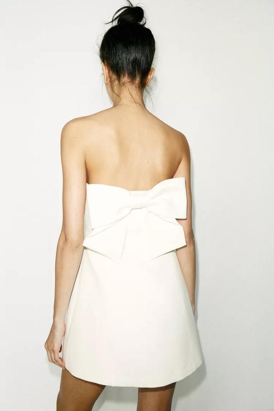Коротка сукня з прямим коміром і відкритими плечима. Бант у тон на спині. Підкладка. Прихована блискавка збоку. БІЛИЙ | 2931/777/250