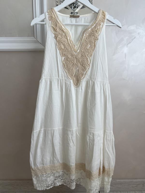 Довжина плаття-сарафану 90 см,напівобʼєм талії 35,може потягнутися до 40 см(резиночка).Виробник Італія .Дуже гарна і ніжна тканина плаття.