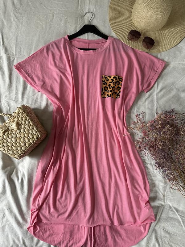Сукня з однією леопардовою кишенею ,та 2 по баках . Повсякденна сукня з короткими рукавами та круглим вирізом , приємного рожевого кольору. Вказано розмір 2Xl ✅ПОГ -60 + тягнеться ПОБ-64 Довжина -перед 87 Зад -101 Тканина -95% поліестер 5% еластан