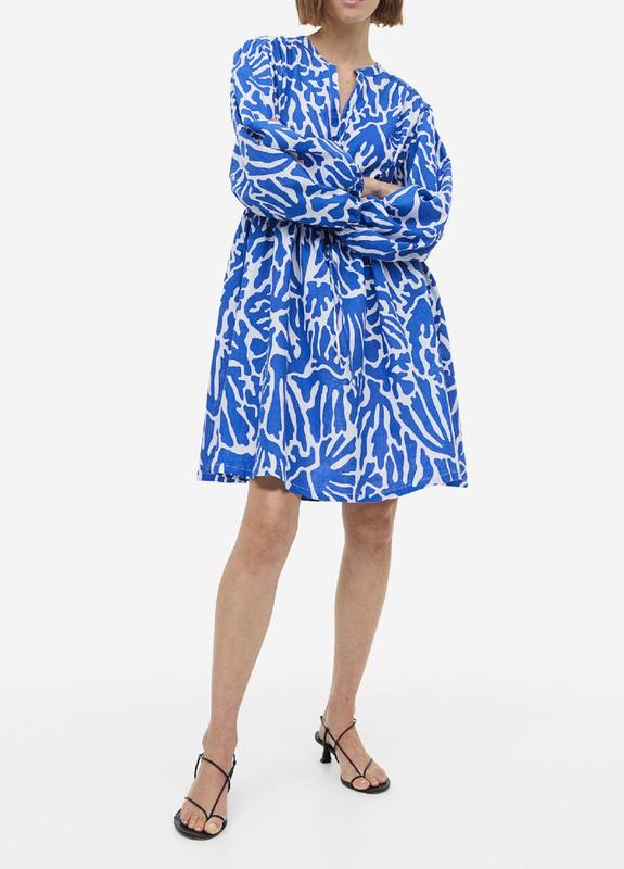 H&M короткое платье из смеси хлопка и льна Качественное платье из смеси хлопка и льна с небольшим воротником-стойкой и V-образным вырезом. Пуговицы сверху и узкая кулиска на талии. Длинные рукава-фонарики с узкой резинкой на манжетах и слегка расклешенная юбка. Без подкладки 52% лён, 45% коттон ◽️Размер указан S, ориентируйтесь на замеры ◽️Длина от плеча до низа 96см., ◽️Ширина в плечах 42см., ◽️Длина рукава 58см., ◽️ПОГ 50см., ◽️ПОт 46см.,( регулируется кулиской) ◽️ПОБ 75см.,