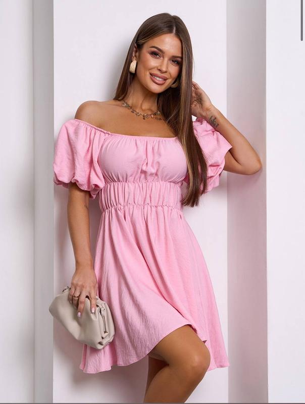 СУКНЯ Арт. SV 617(ремс) Тканина: льон-котон Цвет: белый, голубой, зеленый,розовый, Размеры: S,M, L Описание: Легкое и очень нежное платье с открытыми плечами. Модель с короткими рукавами-фонариками и приталенным кроем. Платье мини длины с расклешенным низом. (Заміри вказані на параметри)