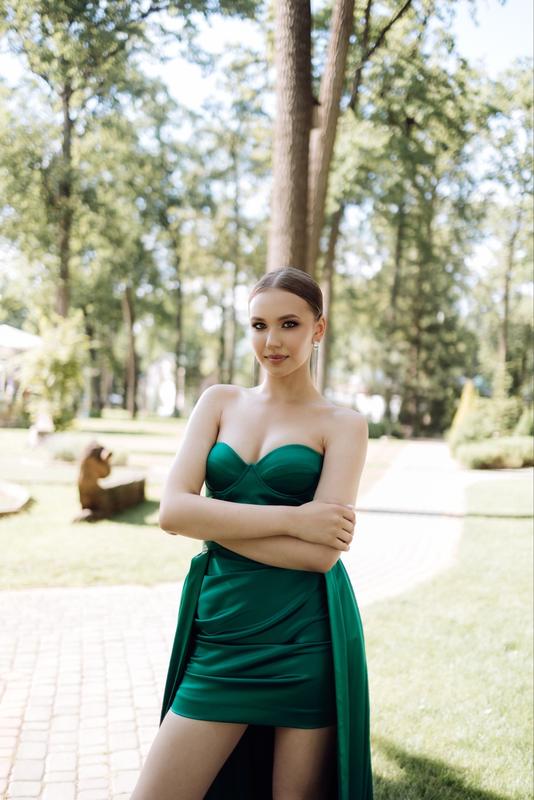 Випускна сукня жіноча зі шлейфом, ручна робота, смарагдового кольору.