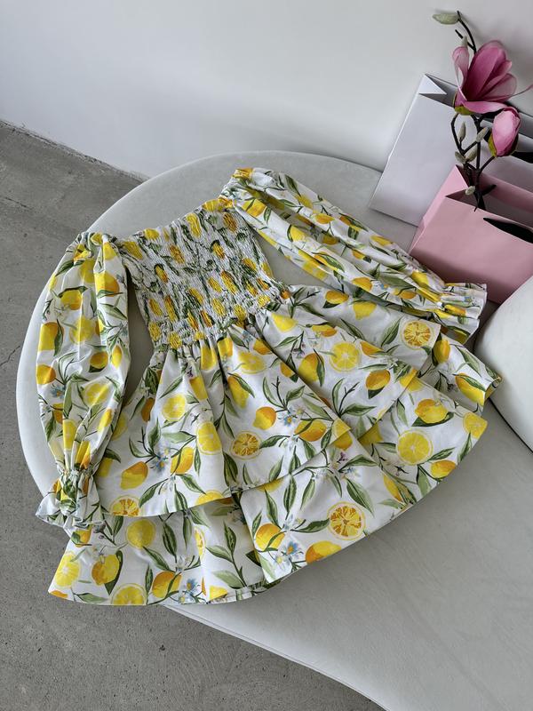 Короткое платье в принт с двойной юбкой и длинными рукавами