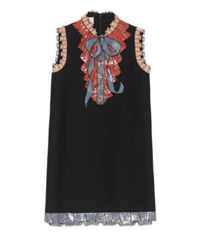 Маленькое черное платье inspired Gucci (натхнен легендарной коллекцией 2016 года). Трендовый стиль – гламурный винтаж 1960-х годов. Нотка романтичности и игривости - декор в виде жабо, графический бант на шее и рюши из пайеток снизу, на пройме рукавов и горловине, спереди пуговицы из кристаллов. Силуэт прямой, ровный, боковые карманы в швах, на спине длинная застежка - молния ниже линии талии, подкладка. Ткань плотная, костюмная, идеально держит форму. Платье must have в гардеробе - можно на свадьбу, на веселую вечеринку с подругами, на романтическое свидание. Рич универсальная. Навеянная образом Блэр из сериала "Плеткарка"). Наживо выглядит непревзойденно. Качество пошива, фурнитуры, отделка, лекала - идеальные. Этикетка с размером срезанная. По факту - S, M. Длина - 87 см. Ширина плечей - 35 см. Объем груди - 88/90 см. Объем талии - 90 см. Объем бёдер - 96 см. Длина молнии - 50 см. Состав - полиэфирная ткань (97%), спандекс (3%). Подкладка - полиэфирная ткань (100%). Стан идеален, без каких-либо нюансов.