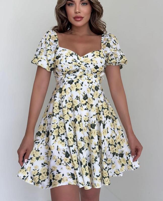 Легка тканина, модні візерунки та стильний фасон цієї літньої сукні довжиною міні підкорять серце кожної модниці! У моделі короткі рукави внизу та вгорі зібрані на вузьку гумку, що дозволяє закривати або оголювати плечі. Спереду розташований вертикальний шов з драпіруванням, а на спинці по центру вшити безліч резинок, які додатково підкреслює фігуру. - 33 см; M – 34 см; L - 35 см Довжина рукава від горловини: S - 37 см; M – 37 см; L - 37 см Довжина рукава по внутрішньому шву: S - 17 см; M – 17 см; L - 17 см Ширина по талії/поясу: S - 28 см; M – 30 см; L - 32 см Довжина виробу: S - 82 см; M – 82 см; L - 82 см Розмір на фото: S Параметри моделі: 84*60*92 зріст 173