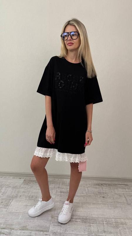 Жіноча туніка-сукня з мереживом Данkr Ідеальний вибір для стильного та комфортного образу! Модель: вільного фасону (оверсайз) Декор: мереживо по низу Принт: об’ємні літери “ABCDEFGH…”. Розмір: універсальний (підходить на 42–48) Матеріал: приємний до тіла трикотаж Виробництво: фабричний Китай Ідеально для: прогулянок, шопінгу, відпочинку, дому 👟 Поєднується з кедами, босоніжками чи балетками. 📸 Доступні кольори: • Сірий • Білий • Чорний • Жовтий
