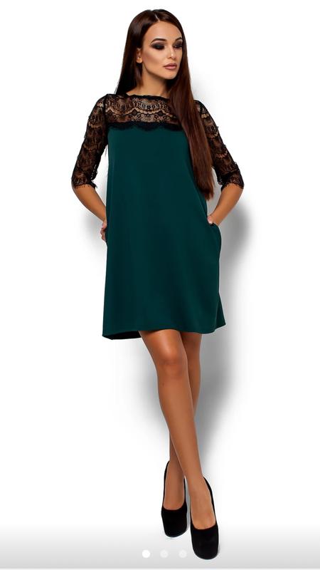 Сукня вільного крою з еластичного трикотажу темно зеленого кольору українського бренду Karree. Верх сукні і рукави виконані з тонкого мережива чорного кольору. Ідеальний стан. Розмір S. Рукав 3/4, в бокових швах є кишені.