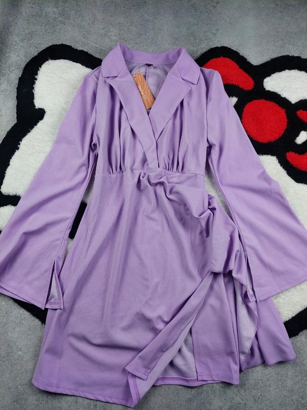 Сукня з шлярою з боку,рукава розклешені з розрізами. Довжина до колін.